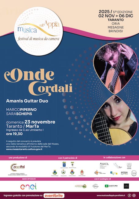TARANTO – E’ prevista per domenica 23 novembre alle ore 20 la tappa a Taranto di “Musica sull’Appia”, festival internazionale di musica da camera. E’ di scena il duo chitarristico Amanis formato da Marco Piperno e Sara Schepis. Il due nasce nel 2023 dal desiderio di esplorare il repertorio chitarristico come strumento di dialogo e racconto.