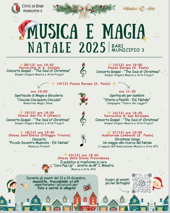 Si continua sabato 13 dicembre alle ore 17:30, all’interno dell’area dedicata ai mercatini natalizi organizzati dal Lions Club Murat di Bari, in piazza Europa, nel quartiere Paolo, con la consegna delle letterine da parte dei più piccoli agli elfi di Babbo Natale: a seguire previste le foto con le mascotte amate dai bambini e, alle 19, appuntamento con il concerto gospel “The Soul of Christmas” a cura della formazione “Gospel Singers – Musica e Arte Project”.