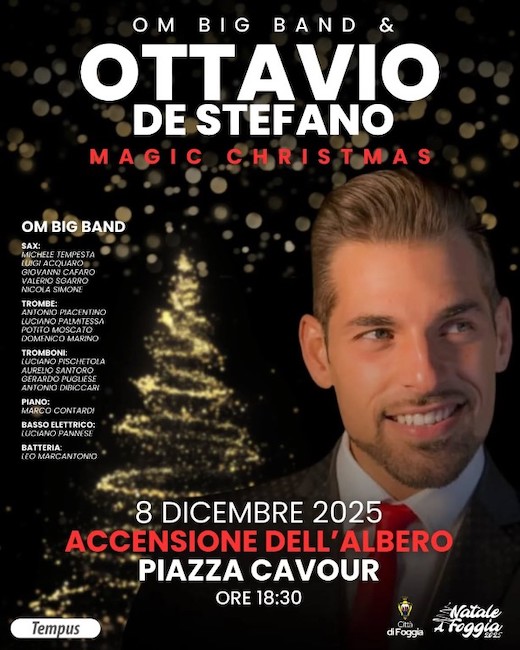 FOGGIA – Non c’è festività dell’Immacolata senza l’attesa accensione dell’albero e senza quelle musiche che, puntuali, riescono a riportarci nella magia del Natale. E quest’anno, a Foggia, quella magia avrà un suono speciale: quello dell’OM Big Band, orchestra di straordinari musicisti del territorio guidata musicalmente dal Maestro Antonio Piacentino, insieme alla voce calda e carismatica di Ottavio De Stefano, per uno spettacolo pensato come un grande abbraccio musicale alla città.