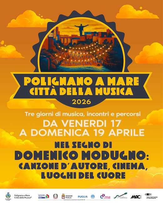 Evento organizzato dal Comune di Polignano a Mare in collaborazione con Regione Puglia e Puglia Culture, intervento finanziato con risorse del Fondo di Rotazione POC 2021-2027 nel quadro dell’accordo tra Puglia Culture e Regione Puglia Sezione Turismo. Con la Direzione Artistica di Stefano Senardi in collaborazione con il Club Tenco e con il Centro Sperimentale di Cinematografia – Cineteca nazionale e con il coinvolgimento di Officina Pasolini, Officina Roversi e MAC (Musica d’Autore Contemporanea)