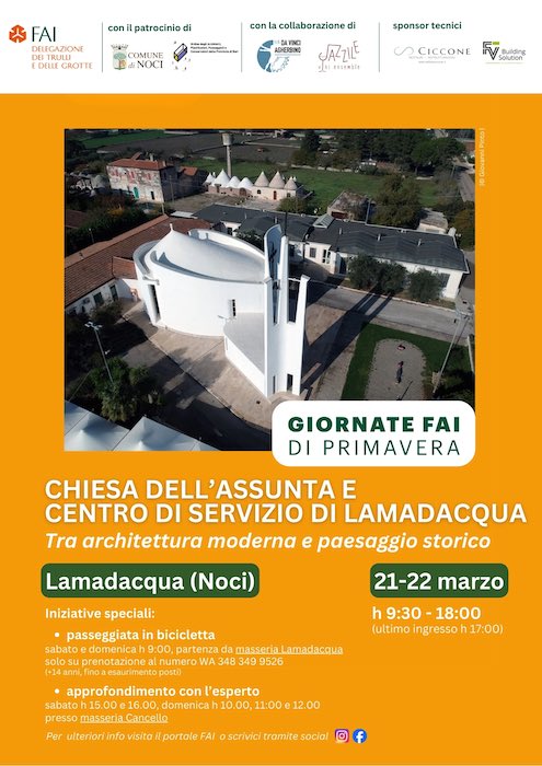 Per le Giornate FAI di Primavera del 21 e 22 marzo le GFP26 della Delegazione FAI Trulli e Grotte a Lamadacqua hanno scelto di aprire la chiesa dell’Assunta. In programma anche  una mostra, approfondimenti con l’esperto e una passeggiata in bicicletta