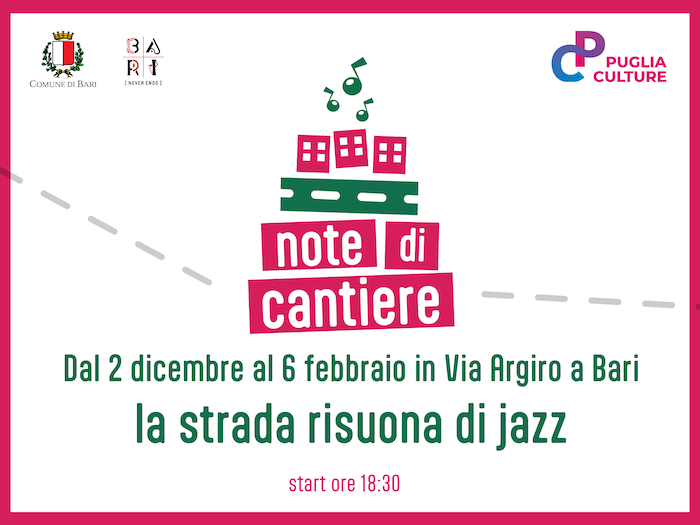BARI – Tutto pronto per “Note di Cantiere”, l’iniziativa promossa dal Comune di Bari, con la collaborazione di Puglia Culture, che trasformerà il cantiere di via Argiro in un palcoscenico a cielo aperto per oltre due mesi. A partire da martedì 2 dicembre, fino al prossimo 6 febbraio, la strada oggetto di un importante cantiere di riqualificazione ospiterà undici concerti gratuiti, organizzati con il coordinamento artistico di Francesca Leone e Roberto Ottaviano che hanno selezionato talenti del jazz pugliese per trasformare gli interventi di rigenerazione urbana in un’occasione di partecipazione e animazione culturale attraverso una serie di eventi musicali.