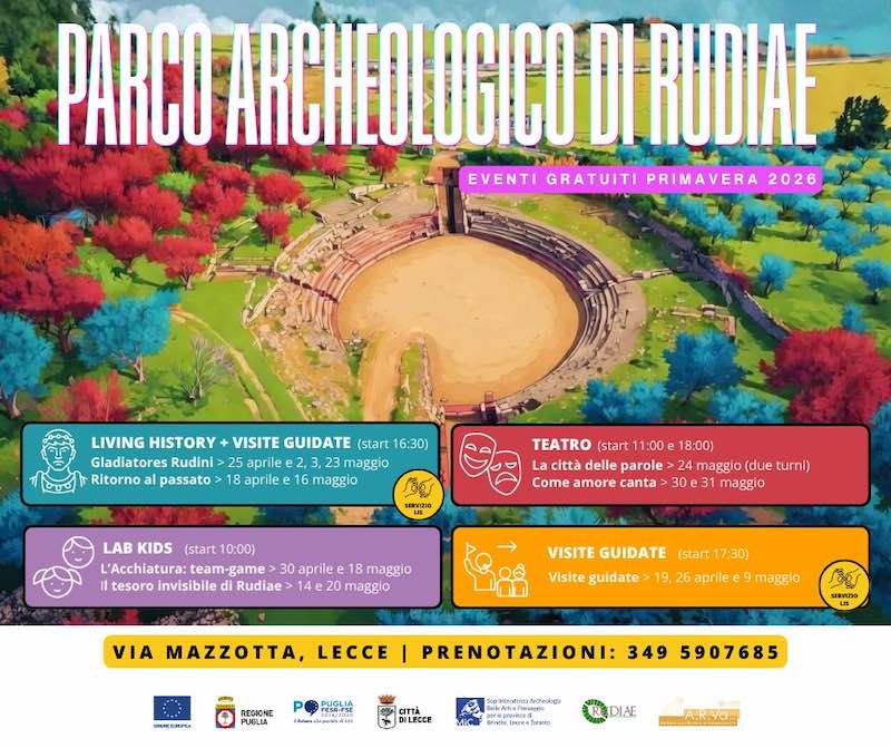 LECCE – Il Parco Archeologico di Rudiae a Lecce riapre le sue porte per una stagione primaverile di eventi gratuiti, pensati per accogliere pubblici diversi e trasformare la visita in un’esperienza condivisa tra spettacolo, didattica e scoperta. Da sabato 18 aprile a domenica 31 maggio (ingresso gratuito con prenotazione obbligatoria al 3495907685), uno dei siti archeologici più importanti della Puglia si trasformerà in un grande laboratorio culturale a cielo aperto, con un ricco calendario di appuntamenti coordinati da A.R.Va srl, tra rievocazioni storiche con la Legio VIII Avgvsta Salento, spettacoli teatrali in collaborazione con Koreja, attività per scuole e famiglie con 34° Fuso e percorsi inclusivi con l’interpretariato in LIS.