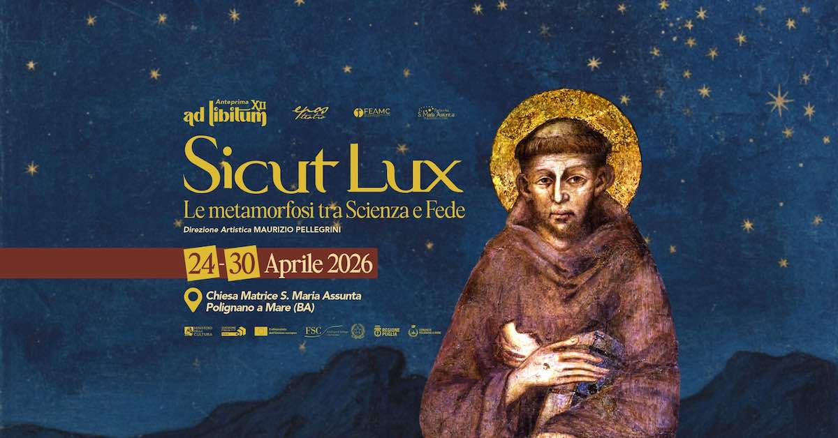 POLIGNANO A MARE (BA) – Polignano a Mare si prepara a vivere una nuova stagione di musica e cultura con la XII edizione di Ad Libitum, la rassegna che negli anni ha saputo valorizzare il territorio attraverso l’incontro di artisti e pubblici diversi, intrecciando linguaggi, sensibilità e visioni. Ad anticipare la programmazione estiva, con le sue novità e i suoi imperdibili appuntamenti, saranno due eventi speciali riuniti sotto il titolo di Sicut Lux – Le metamorfosi tra Scienza e Fede: una “rassegna nella rassegna” che rinnova anche quest’anno il suo doppio appuntamento nella Chiesa Matrice S. Maria Assunta.