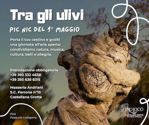 Ognuno porta da mangiare ciò che preferisce e l’attrezzatura per il picnic da utilizzare all’ombra dei “patriarchi verdi” o negli spazi della masseria Andriani, situata in strada comunale Ferrone n. 10 nei pressi delle Grotte di Castellana e a tutto il resto, animazione, musica, giochi e balli, ci pensa la Pro Loco.