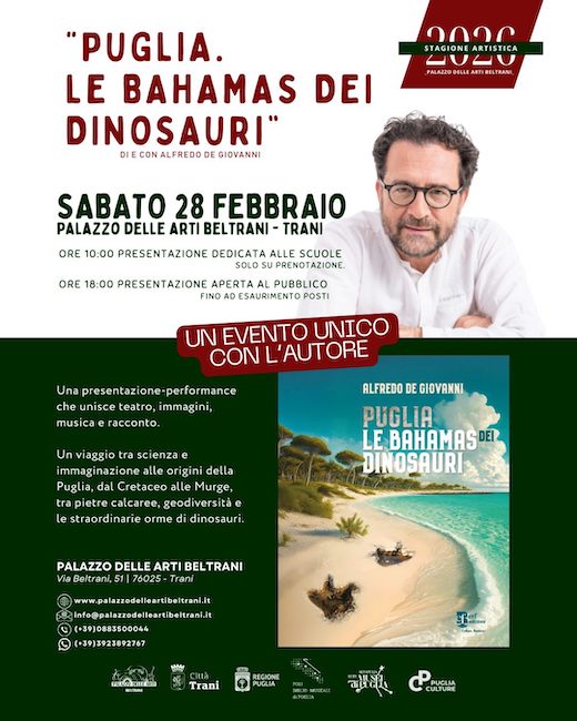 Il 28 febbraio, il Palazzo delle Arti Beltrani ospita due appuntamenti: alle ore 10.00 una speciale sessione dedicata alle scuole superiori, su prenotazione (via email: amministrazione@palazzodelleartibeltrani.it con specifica del numero dei ragazzi e dei docenti accompagnatori), pensata per ragazzi dai dodici anni in su; alle ore 18.00 l’incontro aperto al pubblico, con ingresso gratuito fino a esaurimento posti. Per quest’ultimo appuntamento, la prenotazione è consigliata al link: https://www.eventbrite.it/e/biglietti-puglia-le-bahamas-dei-dinosauri-1982872260308?aff=oddtdtcreator.