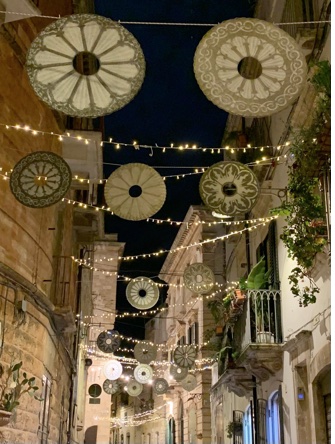 Oltre all’albero di Natale in piazza tra i vicoli del centro storico si può ammirare una cascata di luci e fiscoli decorati in onore dei rosoni delle cattedrali pugliesi, a cura dell’associazione Lavori dal Basso.