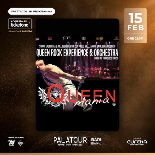 BITRITTO (BA)  – Domenica 15 febbraio, alle ore 21.00, il Palatour di Bitritto ospiterà “Queen Rock Experience and Orchestra” , uno spettacolare tributo ai Queen e a Freddie Mercury. Un grande show, introdotto dalla voce narrante del noto cantautore Enrico Ruggeri, che ripercorre la straordinaria carriera di uno dei più grandi gruppi della storia della musica, arricchito da costumi, scenografie e proiezioni video dall’alto contenuto emozionale. Un concerto per far rivivere la leggenda di Freddie Mercury, che ancora oggi, a quasi trent’anni dalla scomparsa, è ricordato come uno dei più grandi showman della storia.