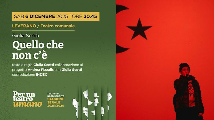 LEVERANO (LE) – Sabato 6 dicembre (ore 20:45 | ingresso 10 – 8 euro) il Teatro Comunale di Leverano, per la stagione Per un teatro umano del progetto Teatri del Nord Salento – promosso da Factory Compagnia Transadriatica in collaborazione con BlaBlaBla – ospita Quello che non c’è di Giulia Scotti. Lo spettacolo – vincitore del Premio Tuttoteatro.com Dante Cappelletti 2023 e menzione speciale del bando Odiolestate 2023 – nasce da una vicenda familiare taciuta per anni: la morte della zia Daniela, una presenza rimossa dalla memoria collettiva e mai raccontata apertamente.