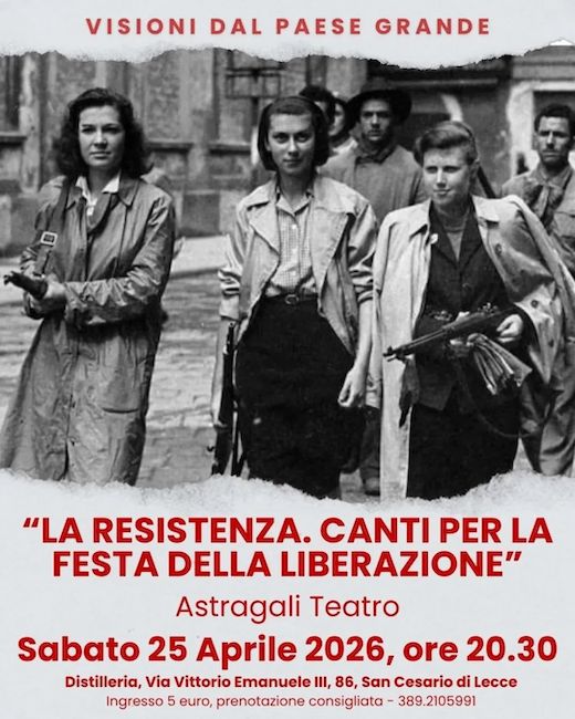 SAN CESARIO DI LECCE – Oggi, sabato 25 aprile, alle ore 20.30, negli spazi della Distilleria De Giorgi, a San Cesario di Lecce, Astràgali Teatro propone, nell’ambito della rassegna “Visioni dal Paese Grande”, un recital sui canti della resistenza, per celebrare l’Anniversario della Liberazione dell’Italia dal nazi-fascismo.