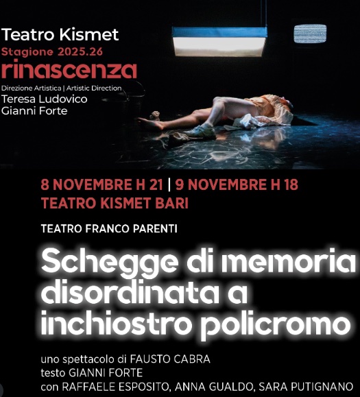 BARI – Venerdì 8 alle ore 21.00 e sabato 9 novembre, alle ore 18.00, per la Stagione la Rinascenza del Teatro Kismet di Bari, andrà in scena lo spettacolo “Schegge di memoria disordinata a inchiostro policromo” che indaga le complessità dell’animo umano e le sue inconfessabili oscurità.
