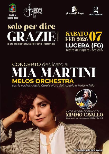 Sabato 7 febbraio, alle 21.15, il Teatro dell’Opera di Lucera ospiterà “Solo per dire grazie”, un concerto dedicato a Mia Martini, affidato alla Melos Orchestra e alle voci di Alessia Carelli, Nura Spinazzola e Miriam Pilla. A impreziosire la serata sarà la partecipazione straordinaria di Mimmo Cavallo, cantautore e storico amico di Mia Martini.