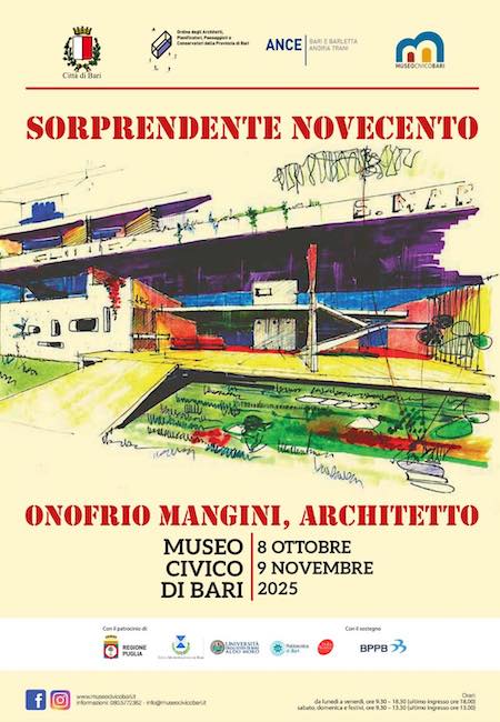 BARI – Oggi, mercoledì 8 ottobre, alle ore 17.30, al Museo Civico di Bari si inaugura la mostra “Sorprendente Novecento”, dedicata alla lunga e intensa carriera d’architetto di Onofrio Mangini, nel centenario della nascita.