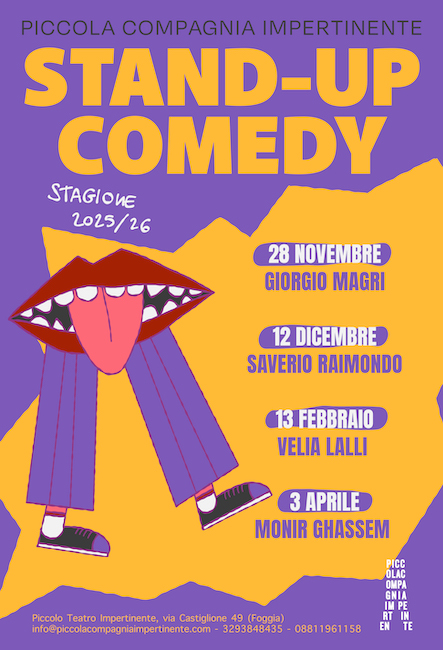 FOGGIA – La Piccola Compagnia Impertinente torna a far ridere – e riflettere – il pubblico con la IV edizione della Rassegna di Stand-Up Comedy, un appuntamento ormai imprescindibile per gli appassionati di comicità contemporanea. Il teatro di Via Castiglione 49 di Foggia si conferma infatti un punto di riferimento cittadino per la stand-up, ospitando anche quest’anno alcuni tra i nomi più noti e apprezzati della scena italiana.