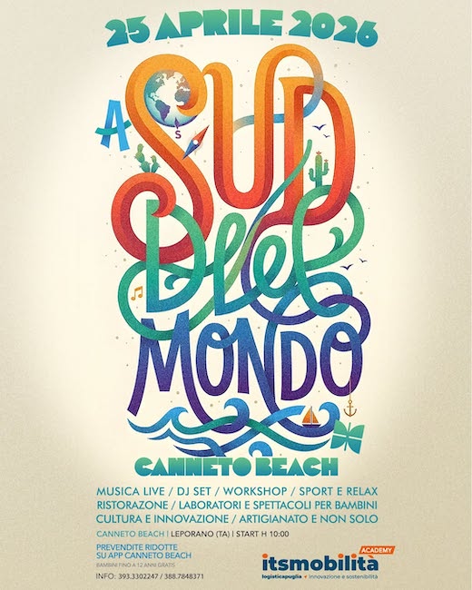 LEPORANO (TA) – Musica live e dj set, swing, social dance e festa anni ‘80/’90, laboratori e spettacoli per bambini, artigianato, cultura, workshop, sport, innovazione, relax e networking. Oggi,sabato 25 aprile al Canneto Beach di Leporano, in provincia di Taranto, dalle 10 e sino a mezzanotte, torna “A Sud del Mondo”, un format che – giunto alla V edizione – è sinonimo di intrattenimento e aggregazione. Quest’anno si caratterizza come una vera e propria piattaforma esperienziale multidisciplinare, capace di integrare cultura, musica, sport, innovazione e partecipazione sociale.