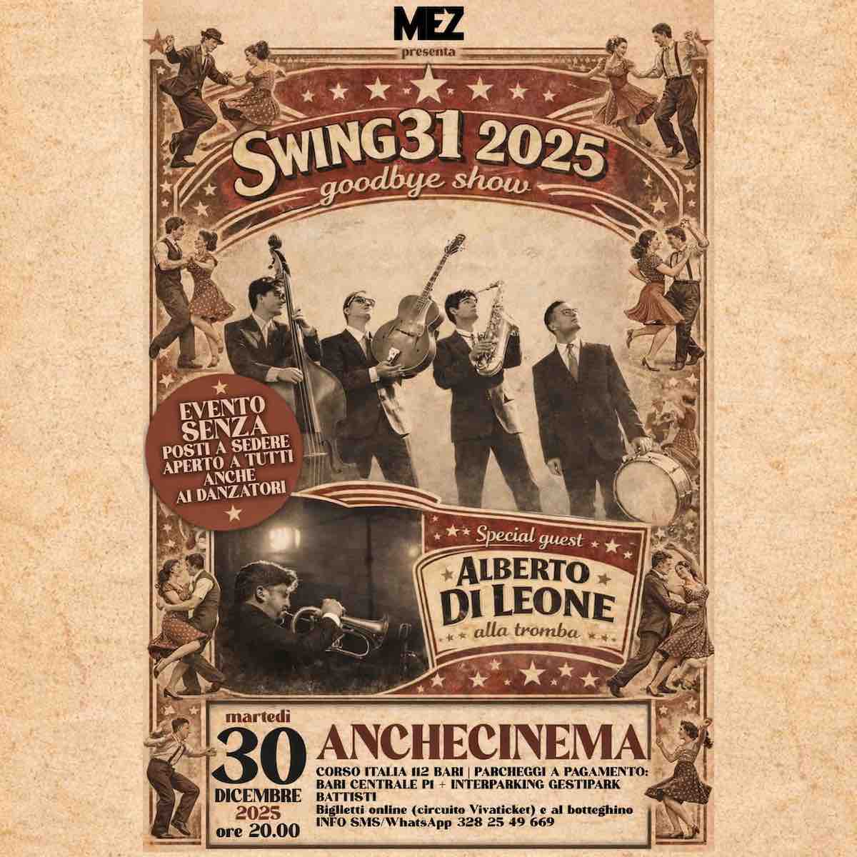 BARI – Mez presenta, in collaborazione con Swing31 e AncheCinema, uno spettacolo sensazionale, con le canzoni della radio che hanno fatto sognare e ballare intere generazioni: Swing31 | 2025 Goodbye Show, evento danzante senza posti a sedere con gli Swing31 dal vivo – special guest Alberto Di Leone alla tromba. L’evento è aperto a tutti, anche ai ballerini Swing e Jive e è in programma martedì 30 dicembre 2025 alle ore 20.00 al teatro AncheCinema di Bari. L’evento mira a valorizzare artisti emergenti del territorio, selezionati nell’ambito del progetto Ecovisioni, promosso da Mez S.r.l.