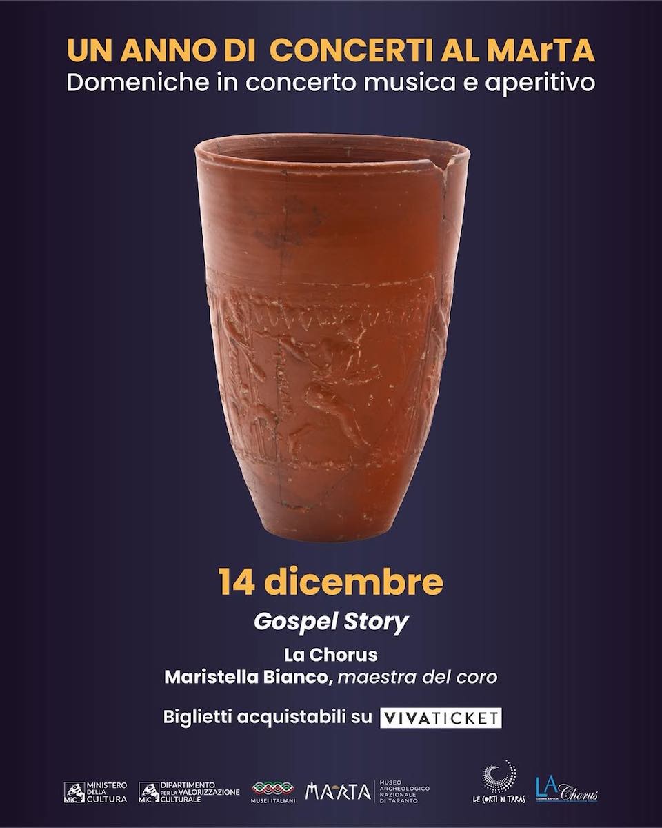 Oggi, domenica 14 dicembre infatti si visiteranno le sale XXIV e XXV del MArTA dedicate alla Taranto multietnica dal IV al XII secolo d.C., alla scoperta di reperti come lucerne e anfore recanti simboli cristiani, iscrizioni funerarie con menorah in lingua ebraica e stele in arabo proveniente dal sito di Santa Maria del Galeso, e alla fine si godrà del più tradizionale dei concerti di Natale dedicato al Gospel (da god Dio e spell racconto).