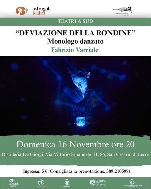 SAN CESARIO DI LECCE – Domenica 16 novembre, alle ore 20.00, presso la Distilleria di San Cesario di Lecce, la rassegna Teatri a Sud di Astràgali Teatro, ospita “Deviazione della Rondine. Monologo Danzato”, performance di teatro e danza, scritta e interpretata da Fabrizio Varriale, prodotta da Akerusia Danza con assistenza alla coreografia di Chiara Alborino, disegno luci di Libero de Martino, fotografia di Simone Marigliano e direzione e coordinamento di Elena D’Aguanno.