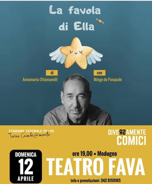 MODUGNO – Ultimo appuntamento della stagione teatrale 2025/2026 al Teatro Fava con “La favola di Ella”, spettacolo scritto da Annamaria Ottomanelli, interpretato da Mingo De Pasquale e inserito nel cartellone della rassegna “Diversamente Comici” promossa dall’associazione “On Stage”.