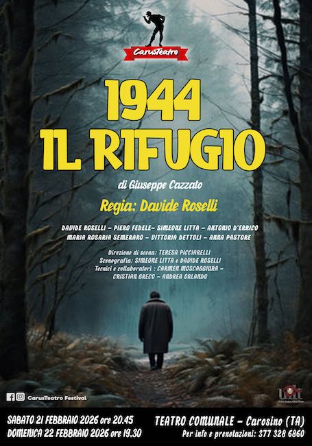 La commedia “1944 Il Rifugio” di Giuseppe Cazzato con l’adattamento teatrale e la regia di Davide Roselli, andrà in scena al Teatro Comunale di Carosino (biglietto singolo 6 euro) in due spettacoli: sabato 21 febbraio alle ore 20.45 e domenica 22 febbraio alle ore 19.30; info e prevendita presso la sede di CarusTeatro Aps, in Viale Risorgimento n.32 a Carosino (cell. 3773286860).