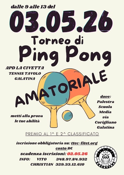 Galatina il 3 maggio 2026 ospita il primo torneo TTEC: il ping pong amatoriale entra in scena con La Civetta