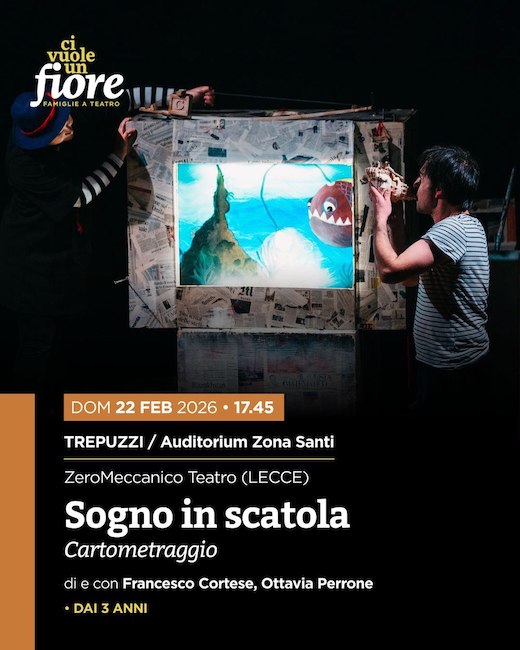 Attraverso l’invenzione del cartometraggio prende vita un sogno lungo trentacinque metri: la storia di un bambino – o forse di molti – alle prese con una montagna di scatole. Sarà la fantasia a condurlo verso luoghi nascosti e sorprendenti, dove tutto diventa possibile. Fondata da Ottavia Perrone e Francesco Cortese, ZeroMeccanico Teatro è una compagnia attiva nella produzione di spettacoli, nella curatela di festival e nella realizzazione di laboratori e percorsi formativi. Con base a Gallipoli, sviluppa progetti rivolti a bambini, ragazzi e adulti, con una particolare attenzione alla diffusione e alla valorizzazione della cultura teatrale contemporanea.