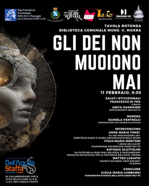 TRINITAPOLI (BT) – La Biblioteca Comunale Mons. V. Morra ospiterà mercoledì 11 febbraio 2026, alle ore 9:30, la tavola rotonda dal titolo “Gli dei non muoiono mai”, un incontro interdisciplinare dedicato alle trasformazioni religiose nel corso della storia, in occasione della mostra di arte contemporanea Sacri Sguardi – tra la storia e il virtuale allestita presso il Museo Civico.