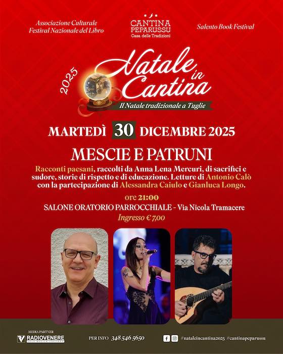 Martedì 30 dicembre alle ore 21 nel Salone Oratorio Parrocchiale di Tuglie si terrà “Mescie e Patruni”, racconti paesani raccolti da Anna Lena Mercuri: storie di sacrifici e sudore, di rispetto e di educazione. Letture di Antonio Calò, con la partecipazione di Alessandra Caiulo e Gianluca Longo. Ingresso 7 euro.