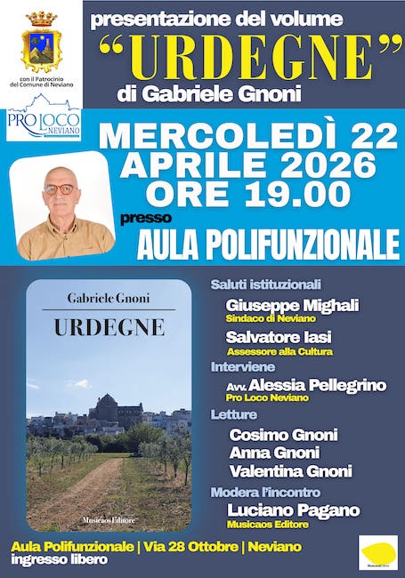 “Urdegne”, termine del dialetto nevianese che significa “cose miste messe lì per caso”, riflette la natura frammentaria e spontanea dei ricordi facenti parte dei racconti contenuti nel volume. Durante l’infanzia, il contatto con gli adulti e la povertà suscitavano stupore, sensazioni poi dimenticate con la crescita. Con l’età o la nostalgia, i ricordi riaffiorano intensi, spingendo l’autore a fissarli sulla carta. Questa raccolta vuole fare memoria e testimonianza a giovani e adulti, non solo di Neviano, sulla vita vissuta in un piccolo paese della penisola salentina, tra gli anni Cinquanta e Settanta. Si tratta infatti di racconti che riannodano le memorie e allo stesso tempo offrono spunti di riflessione. Un modo per conoscere le usanze tipiche, non solo della comunità nevianese, e un dialetto che diviene patrimonio di tutti nel momento in cui diviene luogo di nuove narrazioni. Ingresso libero.