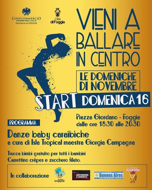 L’iniziativa, realizzata in co-organizzazione con il Comune di Foggia, nasce per sostenere il commercio di prossimità e restituire vitalità e partecipazione al centro urbano. Tre gli appuntamenti previsti: 16, 23 e 30 novembre, dalle 18.00 alle 20.30. Ad aprire il programma sarà, il 16 novembre, la scuola di danza La Isla Tropical, che si esibirà con una delegazione di bambini e bambine in uno spettacolo ricco di energia e colore.